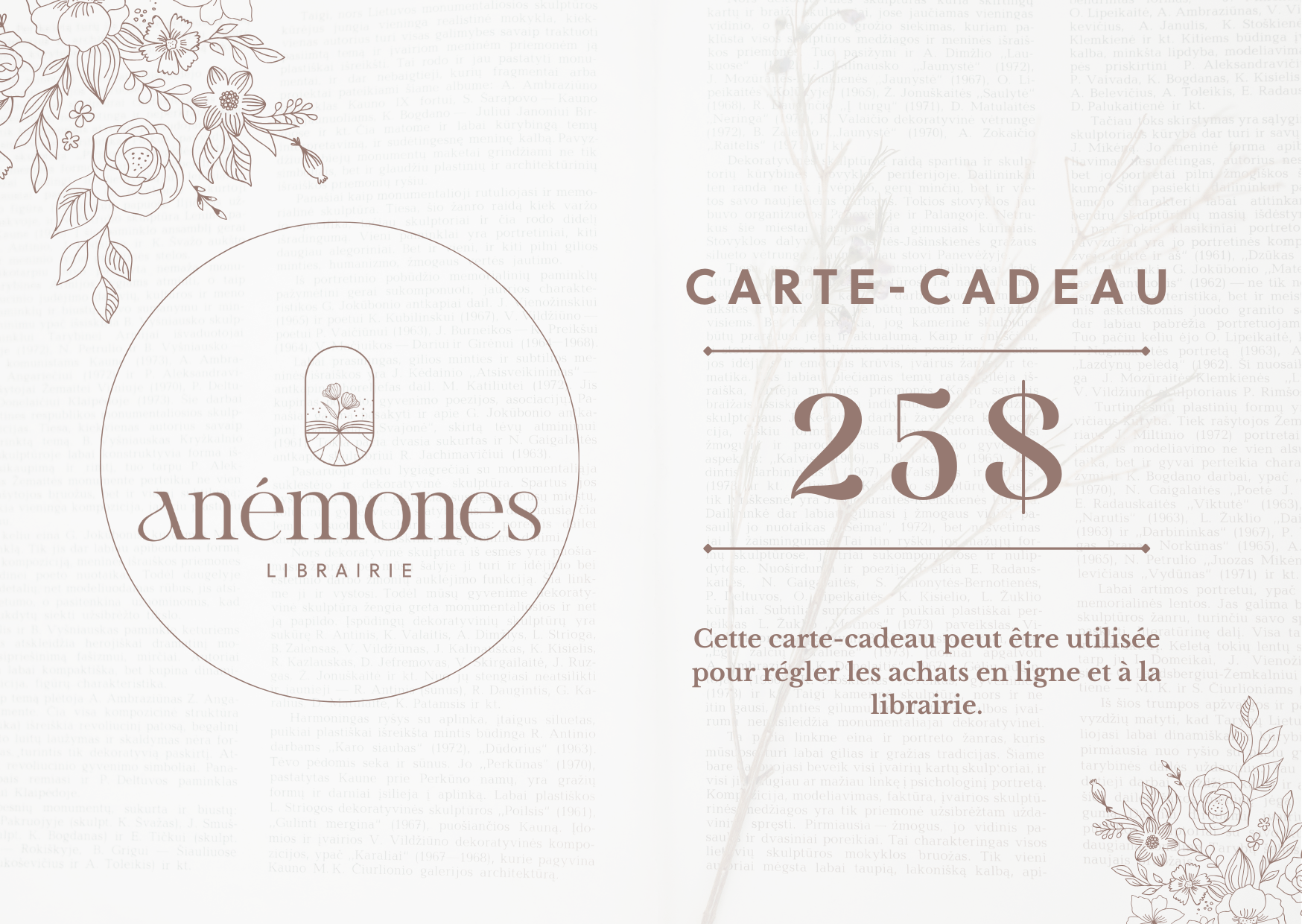 Offrez le cadeau parfait avec nos cartes-cadeaux de la Librairie Anémones! Valides en boutique et en ligne, elles permettent de choisir parmi une vaste sélection de livres neufs et d'occasion, incluant les nouveautés littéraires. Elles combleront à coup sûr tous les passionnés de lecture!